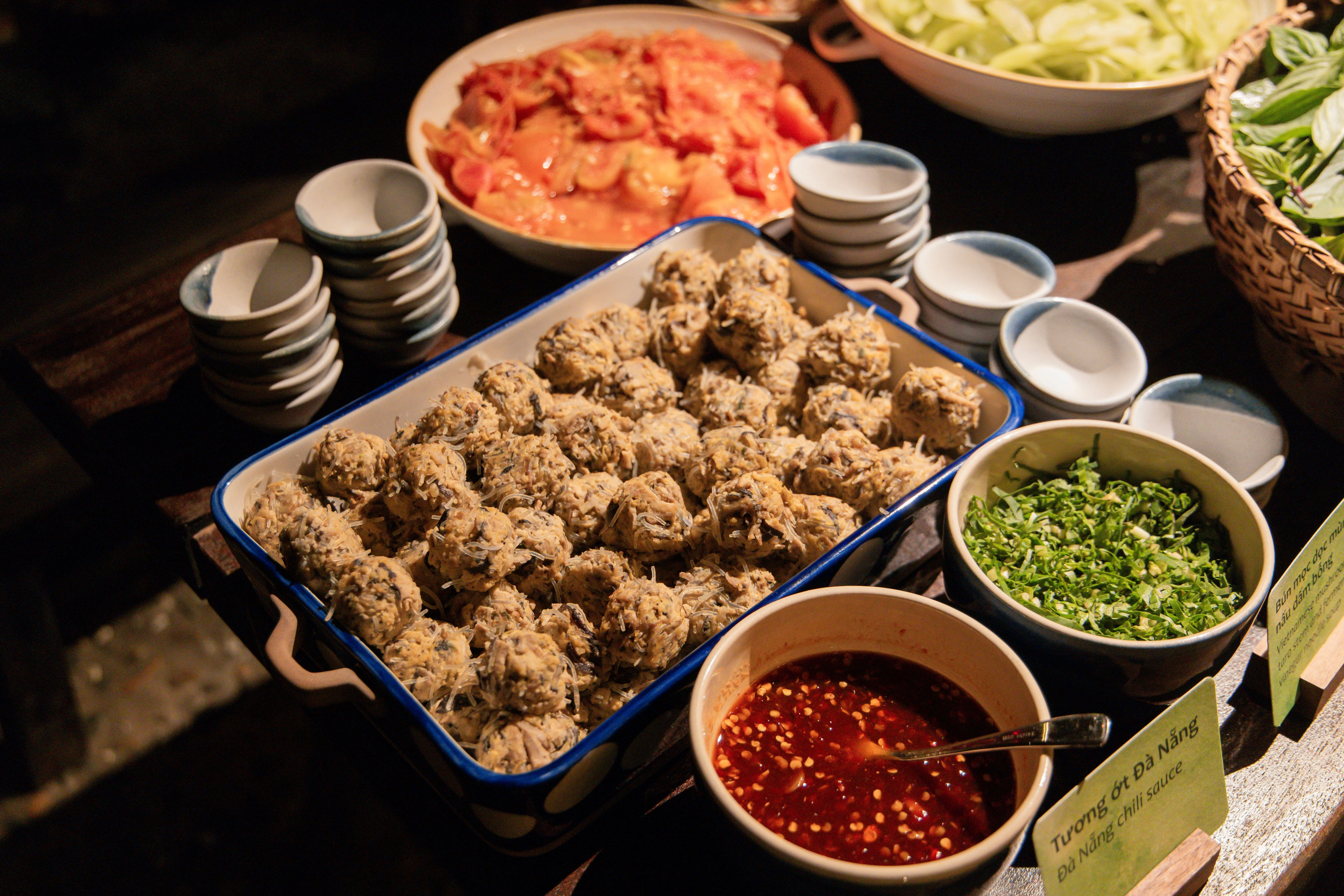 “Nông Sản Quê Nhà – Thu” còn mang đến món Bún mọc dọc mùng nấu dấm bỗng được thực khách vô cùng yêu thích. Lấy cảm hứng từ món ăn thuần túy của miền Bắc hợp với tiết trời thu se lạnh, món ăn này có nước dùng thanh nhẹ, nóng ấm với vị chua dịu từ dấm bỗng, giòn mát của dọc mùng. Điểm đặc biệt chính là viên mọc được chế biến hoàn toàn từ nguyên liệu thực vật, vừa thanh đạm vừa giàu dinh dưỡng.