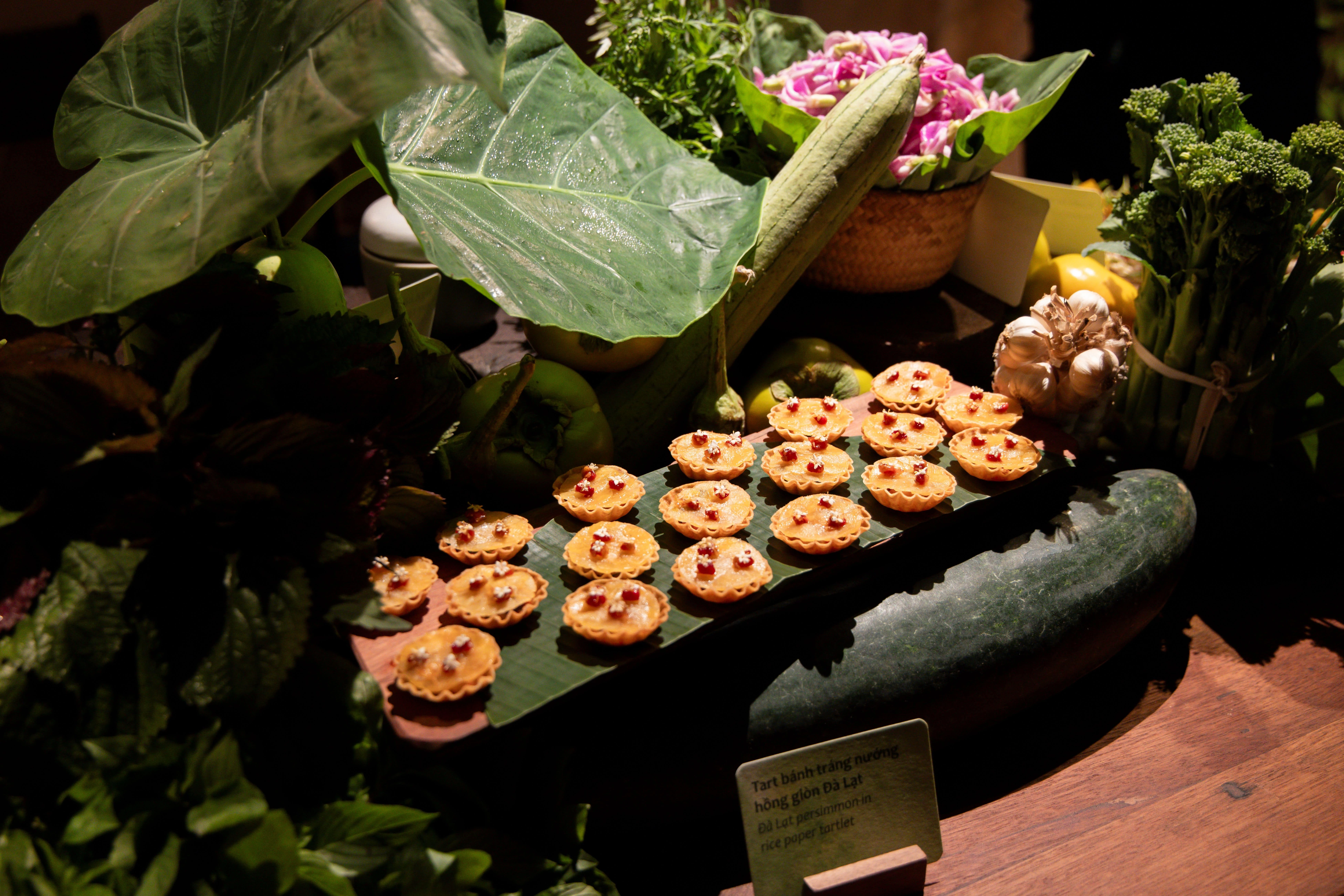 Bữa tiệc mỹ vị thực vật thanh lành khép lại với những món tráng miệng cũng rất cuốn vị giác bởi vị ngọt nhẹ và thanh mát của Chè long nhãn Hưng Yên hạt sen Huế, Chè khoai cánh tiên Phan Thiết, bánh hồng Đà Lạt hay bánh cốm Hà Nội. Trong đó, Chè long nhãn Hưng Yên hạt sen Huế để lại một dư vị khó quên khi được chế biến đặc biệt với nước cất từ sen trắng cổ Bạch Liên Huế giúp bổ khí huyến, an thần và dưỡng tâm. Tất cả hòa quyện không chỉ giữ sự thanh tao của hương vị mà còn nhắc nhớ sự tinh tế của ẩm thực truyền thống xứ Huế kinh kỳ xưa.