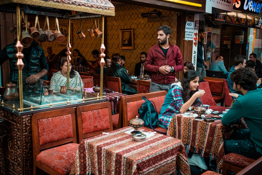 Ở Istanbul, không gian đàn ông tụ họp không phải quán bar mà là kahvehane - những quán cà phê truyền thống gói trọn linh hồn di sản Ottoman. Ghế gỗ thấp, bàn nhỏ, tiếng xúc xắc của bàn cờ backgammon, báo giấy gấp đôi trên tay những ông lão tóc bạc. Không có âm nhạc lớn, không có laptop, không ai đeo tai nghe.