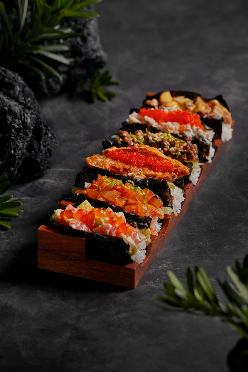 Điểm nhấn không thể bỏ lỡ còn phải kể đến Sushi Handroll (sushi cuộn cầm tay) – xu hướng ẩm thực từng “gây bão” tại Bangkok năm 2025. Với lựa chọn nhân đa dạng từ cá ngừ cay nồng đến cua lột chiên giòn, thực khách có thể thưởng thức tuỳ chọn (à la carte) hoặc trải nghiệm theo set (handroll flight) để cảm nhận trọn vẹn lớp rong biển giòn tan ôm trọn phần nhân tươi ngon. Trải nghiệm sẽ càng thêm thăng hoa khi dùng kèm các set rượu Sake (Sake Flight) tinh tuyển, khơi dậy vị ngon đậm đà (umami) bùng nổ nhưng hài hòa, cân bằng.