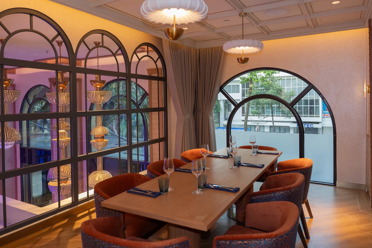 Không gian nhà hàng được thiết kế tinh xảo với sức chứa lên đến 125 khách, trải rộng qua ba khu vực riêng biệt: Tầng trệt sáng rỡ với cửa sổ hình vòm và ánh sáng tự nhiên ngập tràn, tầng hai là một không gian vô cùng lý tưởng cho các buổi họp mặt riêng tư và khu hiên ngoài trời lộng gió gợi nhớ những buổi tiệc tối thanh lịch bên bờ biển (seaside soirées).