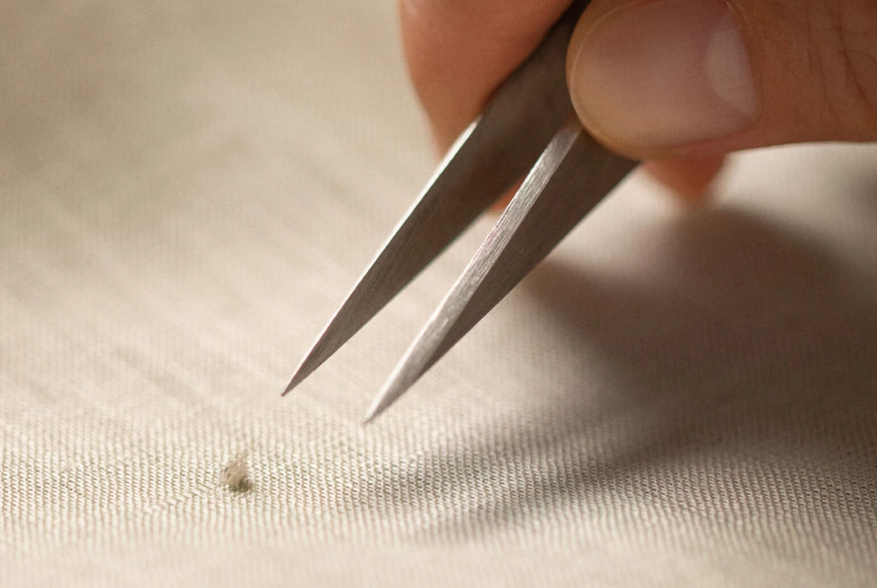 Các xơ vải thô tiếp tục được xử lý bằng phương pháp thủ công, thông qua kiểm tra trực quan và thao tác bằng tay. Sản phẩm đồng thời được hoàn thiện bằng các kỹ thuật may khác nhau cho từng bộ phận, như may phần gấu tay áo dưới hoặc may nẹp áo với ba lớp gấp, nhằm tăng độ bền trong quá trình giặt và sử dụng.
