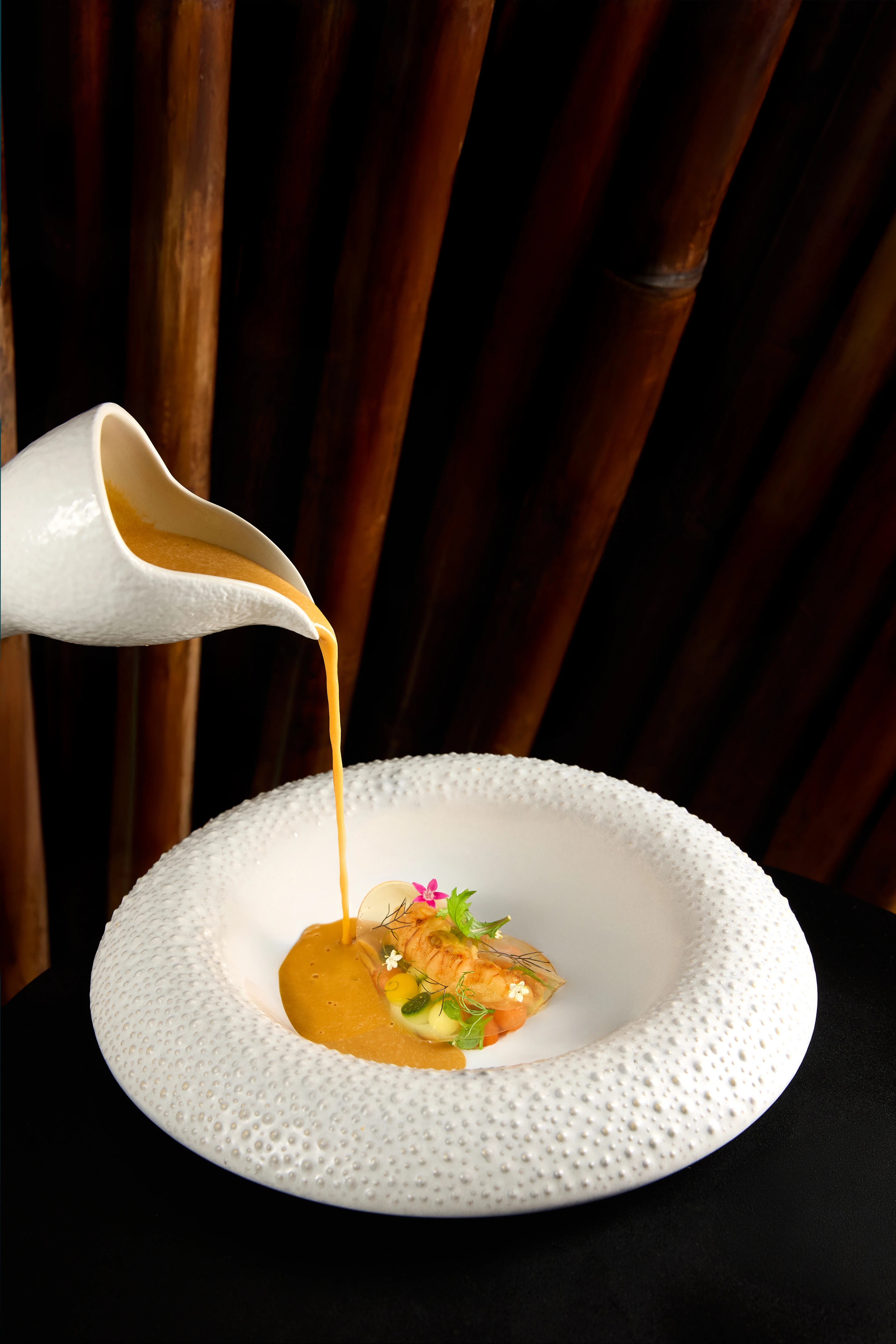 Món súp này là sự giao thoa giữa tinh thần ẩm thực Pháp cổ điển và nguyên liệu Việt Nam đặc sắc - tôm mũ ni tươi từ vùng biển Phú Quốc. Tôi sử dụng kỹ thuật nấu chậm trong bơ để giữ trọn vị ngọt tự nhiên của thịt tôm, kết hợp cùng jelly tôm thanh nhẹ, rau củ cắt tỉa tỉ mỉ, và dầu thảo mộc để tạo nên những tầng hương vị tinh tế và hài hòa.