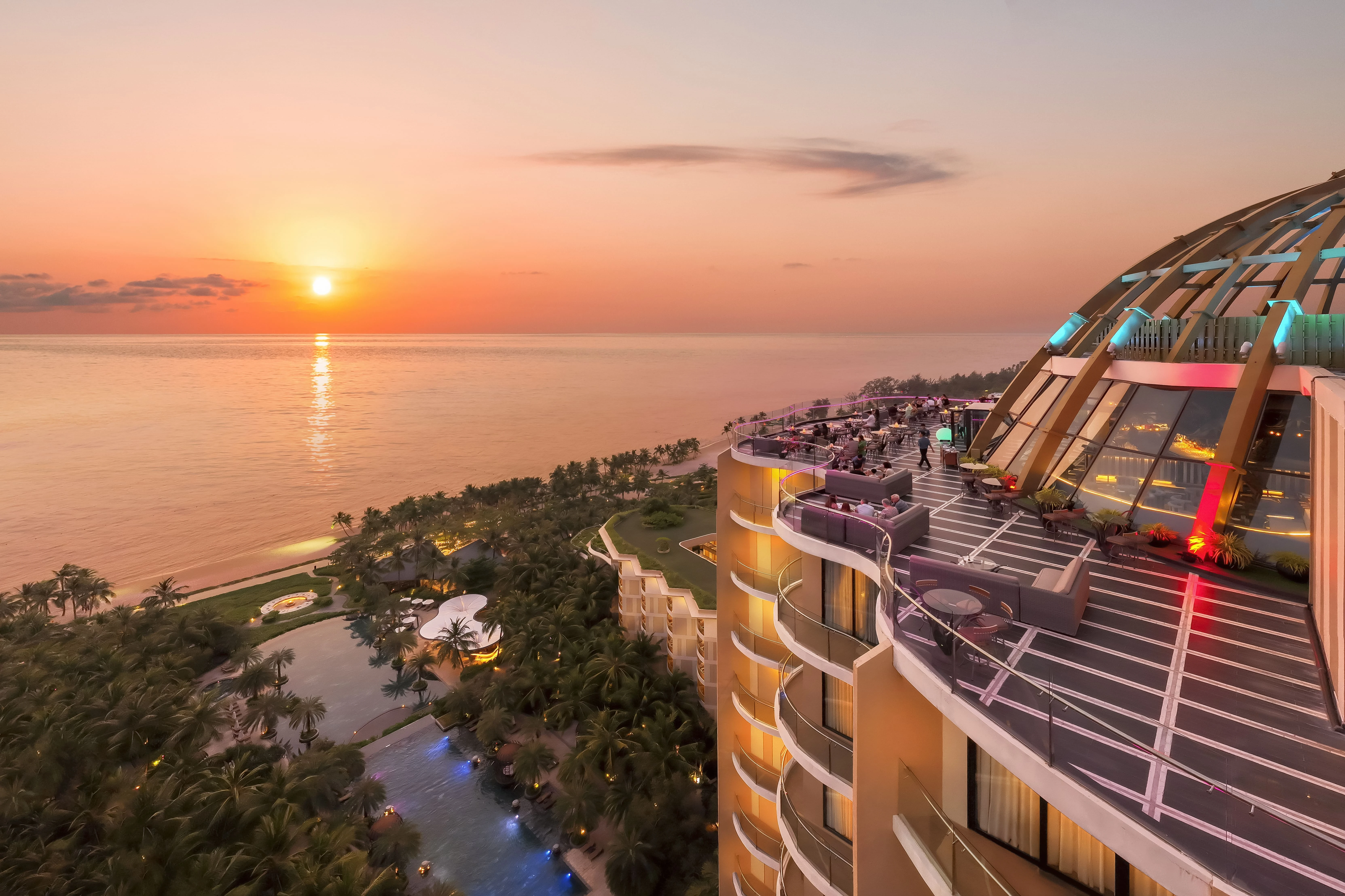 Và chính trong giấc mơ ấy, hoàng hôn trở thành nghi lễ không thể bỏ lỡ. Tại nơi được xem là cao nhất của đảo Ngọc, ánh mặt trời từ từ chìm xuống làn nước xanh thẫm, để lại nơi đường chân trời một bức tranh rực rỡ của những dải màu cam sáng lẫn với hổ phách, của tím than ẩn hiện trong hồng ngọc. Mọi âm thanh như lắng lại, chỉ còn khoảnh khắc hòa hợp giữa thiên nhiên và con người. Bóng tối dần buông, DJ lên nhạc, nhịp sống trẻ bùng nổ trong những giai điệu sôi động biến không gian lặng yên của hoàng hôn thành bữa tiệc đầy sức sống.