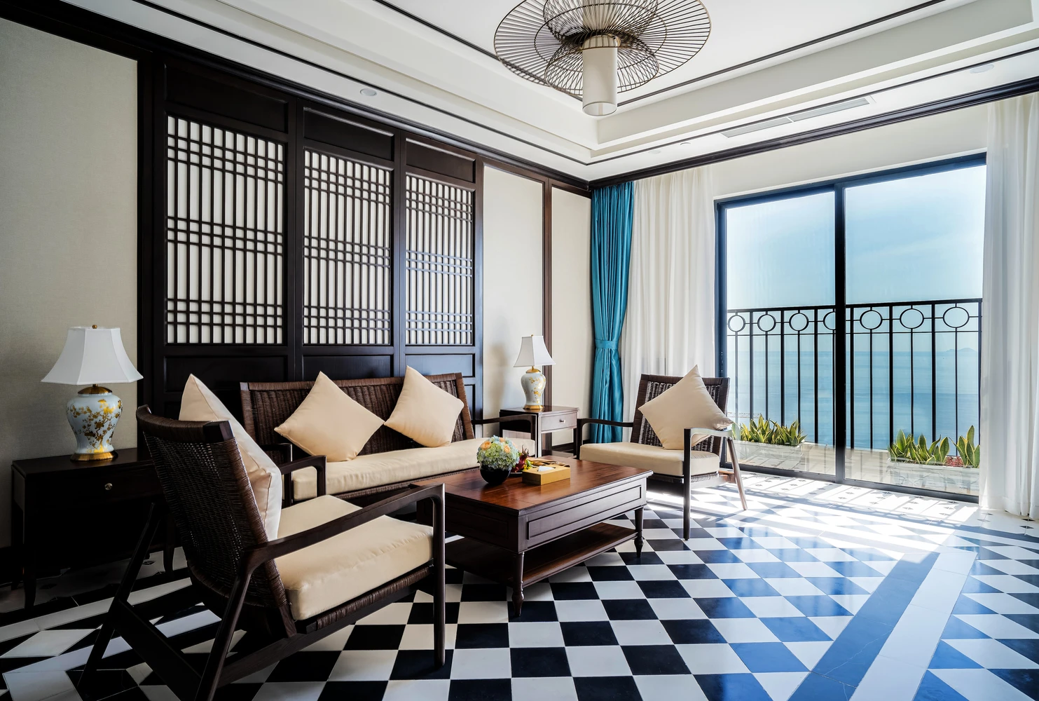 Phòng nghỉ mang phong cách Đông Dương thanh lịch, kết hợp hài hòa giữa nét cổ điển và tiện nghi hiện đại.