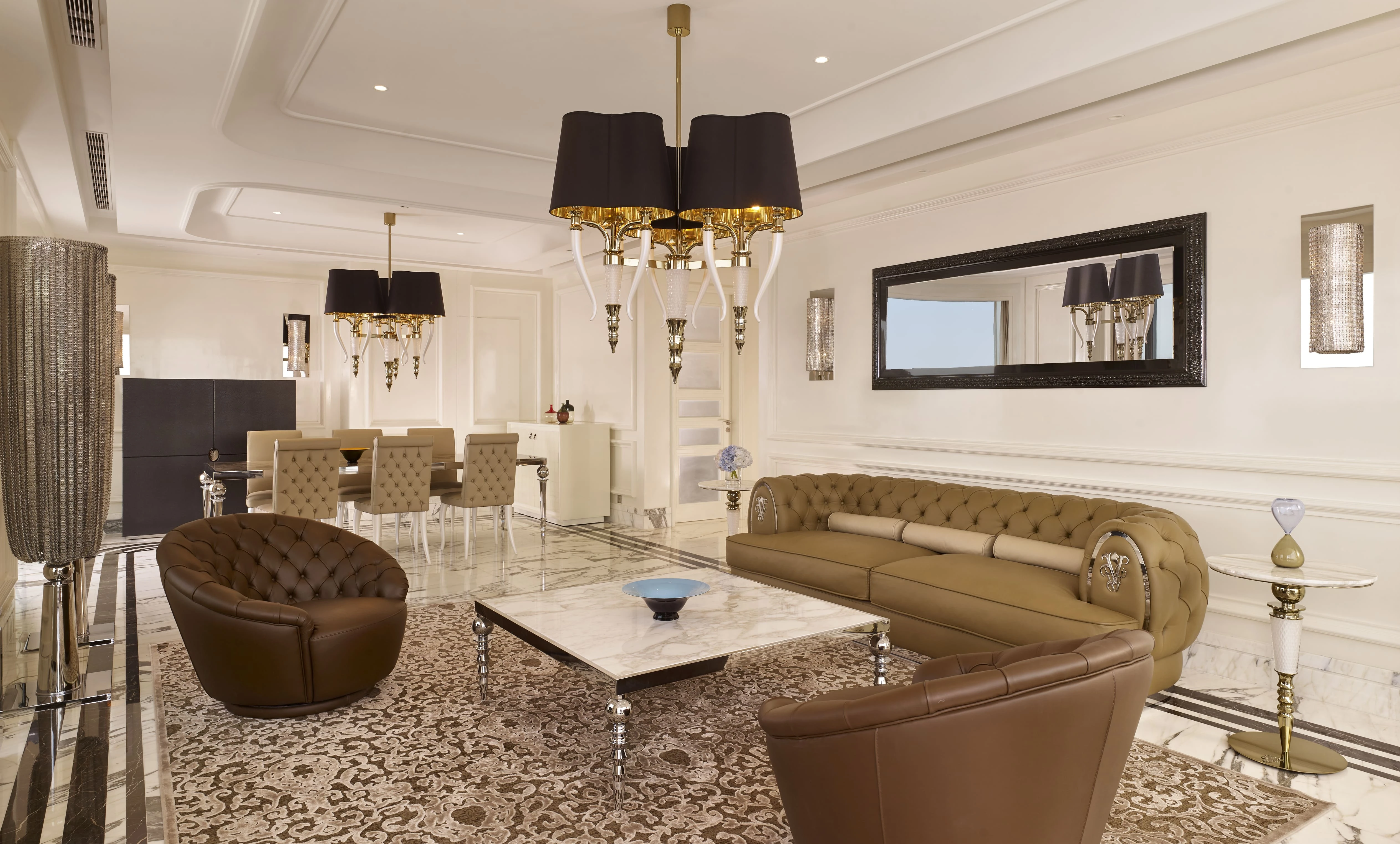 Với những du khách yêu thích nghệ thuật nội thất Ý trong gam màu be thanh lịch thì Designer Suite by Visionnaire chính là lựa chọn hoàn hảo. Điểm nhấn độc bản của căn phòng rộng 126 mét vuông này chính là sự kết hợp của chiếc đèn chùm pha lê Esmeralda - phong cách quý tộc châu Âu cùng chiếc đèn Excalibur đính pha lê Swarovski - lấy cảm hứng từ thanh kiếm huyền thoại của vua Arthur, tạo hiệu ứng ánh sáng vừa quyền lực vừa mê hoặc. Bên cạnh đó, du khách có thể ngắm nhìn trọn vẹn nhịp sống thành phố trên chiếc Sofa Oberon màu be trang nhã được chế tác từ khung gỗ tần bì và gỗ thông, kết hợp với lớp đệm Memory Foam và lông vũ mềm mại. Mỗi chi tiết trong Designer Suite by Visionnaire thể hiện tính thẩm mỹ thanh lịch, nâng trải nghiệm tại The Reverie Saigon lên tầm tinh tế mới.