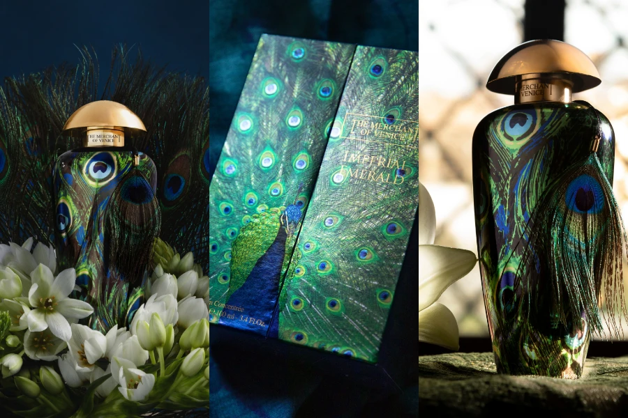 Lấy cảm hứng từ hình tượng chim công – biểu tượng của sự sang trọng, quyền quý và may mắn – Imperial Emerald là hương thơm khoác lên mình vẻ đẹp rực rỡ đúng tinh thần lễ hội. Thiết kế chai ngọc lục bảo mô phỏng màu lông công huy hoàng, điểm họa tiết Murano thủ công, tạo nên một tác phẩm nghệ thuật sắc sảo ngay từ cái nhìn đầu tiên.