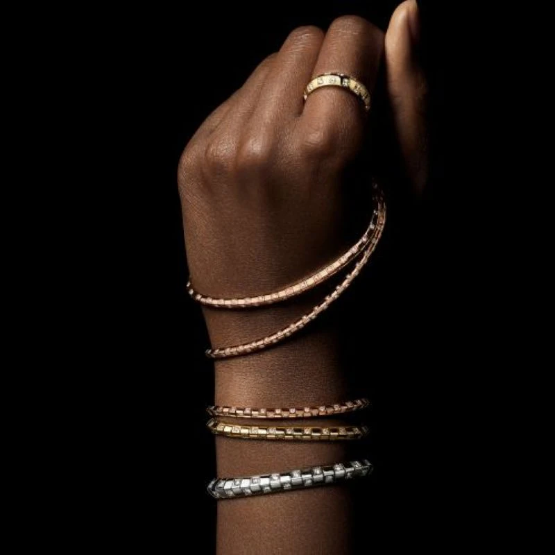 Hai mẫu vòng tay mới tiếp tục mở rộng khả năng phối chồng để tạo nên phong cách mạnh mẽ và tuyên ngôn cá tính. Những điểm nhấn mới bao gồm vòng tay vàng hồng mảnh 3,5mm và vòng tay vàng trắng 5mm, kết hợp cùng ba thiết kế vòng tay đã có trong bộ sưu tập, mang lại một dải lựa chọn phong phú về sắc vàng và kích thước.