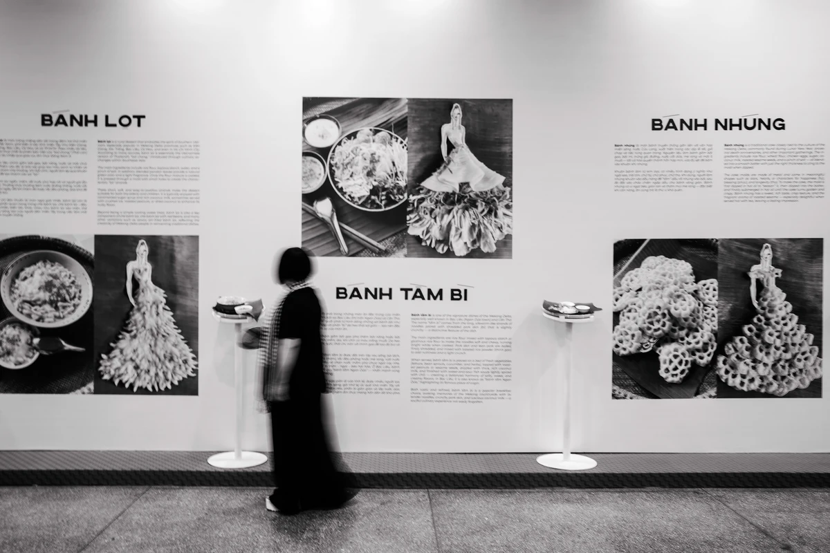 Bên cạnh sàn diễn, “Miệt Cù Lao” còn mang đến một triển lãm văn hoá đa giác quan, nơi người xem có thể đắm mình trong hành trình ký ức thông qua hai khu vực chính: “Vùng Ký Ức” nơi trưng bày 13 bộ trang phục còn lại trong không gian gợi nhớ ngôi nhà xưa, vườn chuối, chiếc cầu treo đậm dấu ấn tuổi thơ miền Tây. “Bếp Xưa” là góc nhỏ ấm cúng tái hiện căn bếp dân dã, nơi khách tham quan có thể thưởng thức bánh dân gian, trà sen, trà thảo mộc và cảm nhận hơi ấm quê nhà. Toàn bộ trải nghiệm tại triển lãm được Nguyễn Minh Công thiết kế như một bản giao hưởng của cảm xúc đưa người xem đi qua từng mảng ký ức quê hương bằng tất cả giác quan.