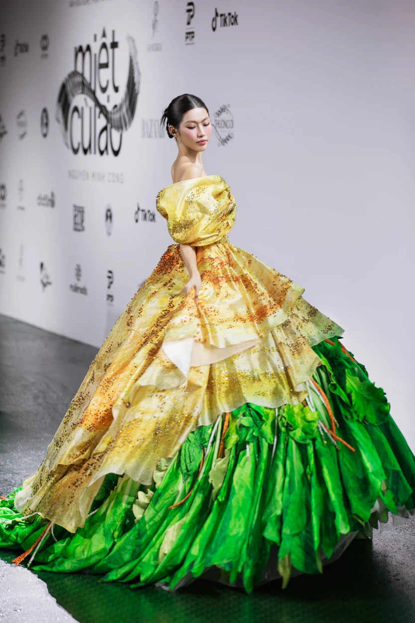 Với 7 thiết kế đại diện cho 20 mẫu thiết kế ấn tượng của BST được trình diễn bởi dàn hoa hậu, siêu mẫu hàng đầu Việt Nam, Nguyễn Minh Công như mang đến một câu chuyện văn hóa được kể bằng thời trang giao thoa nét đẹp dân gian và ký ức quê hương.