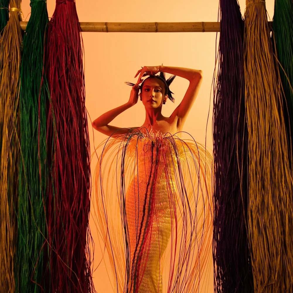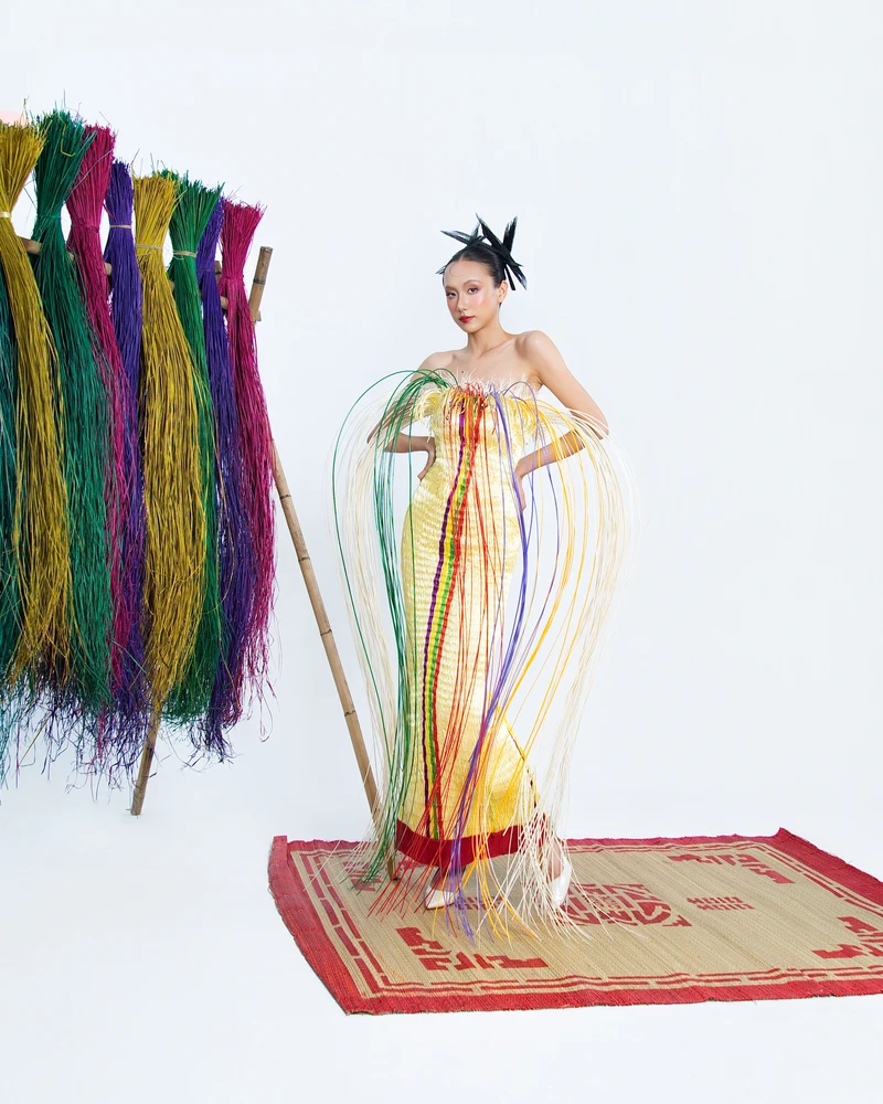 Không chỉ dừng lại ở thiết kế, Bùi Hoàng Ân còn đầu tư đáng kể cho phần hình ảnh. Bộ ảnh lookbook được xây dựng như một câu chuyện hoàn chỉnh, thay vì chỉ là những khuôn hình nhằm phô diễn trang phục. Hơn 20 chiếc chiếu cùng hàng trăm sợi cói được mua trực tiếp từ làng Định Yên và được đặt để tinh tế giúp xây dựng bối cảnh trở nên sống động.