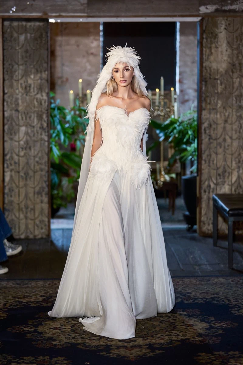 Thiết kế đầm WINGS OF HOPE được phủ đầy lông vũ tinh khôi – mềm mại, bay bổng, như biểu trưng cho khát vọng tự do và ý chí vươn xa mạnh mẽ.