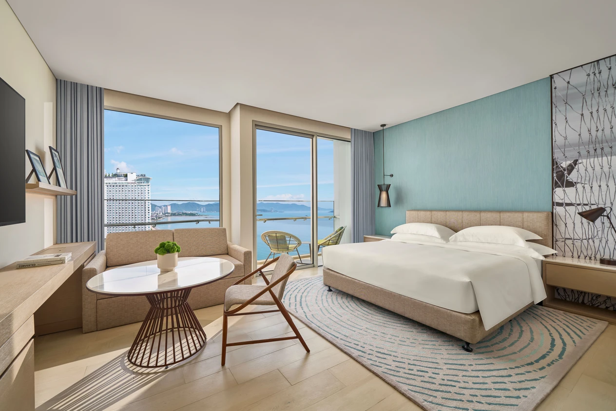 Được lấy cảm hứng từ hình ảnh con thuyền vươn ra biển lớn, kiến trúc khách sạn gây ấn tượng với các đường nét trải dài ôm trọn đại dương bao la, ghi dấu ấn thị giác hài hòa với cảnh quan ven biển xung quanh. Sở hữu 434 phòng nghỉ và suite sang trọng, khách sạn kiến tạo không gian nghỉ dưỡng riêng tư, thư thái, phù hợp đa dạng nhu cầu của du khách. Mỗi phòng nghỉ được thiết kế tinh tế, đón trọn ánh sáng tự nhiên, mở ra tầm nhìn hướng biển rộng thoáng, đồng thời mang lại cảm giác ấm áp, dễ chịu cho du khách.