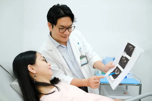 ThS.BS Võ Triệu Đạt, Trưởng khoa Sản FV Thomson tư vấn chương trình chăm sóc thai sản trọn gói tại FV. Ảnh: FV